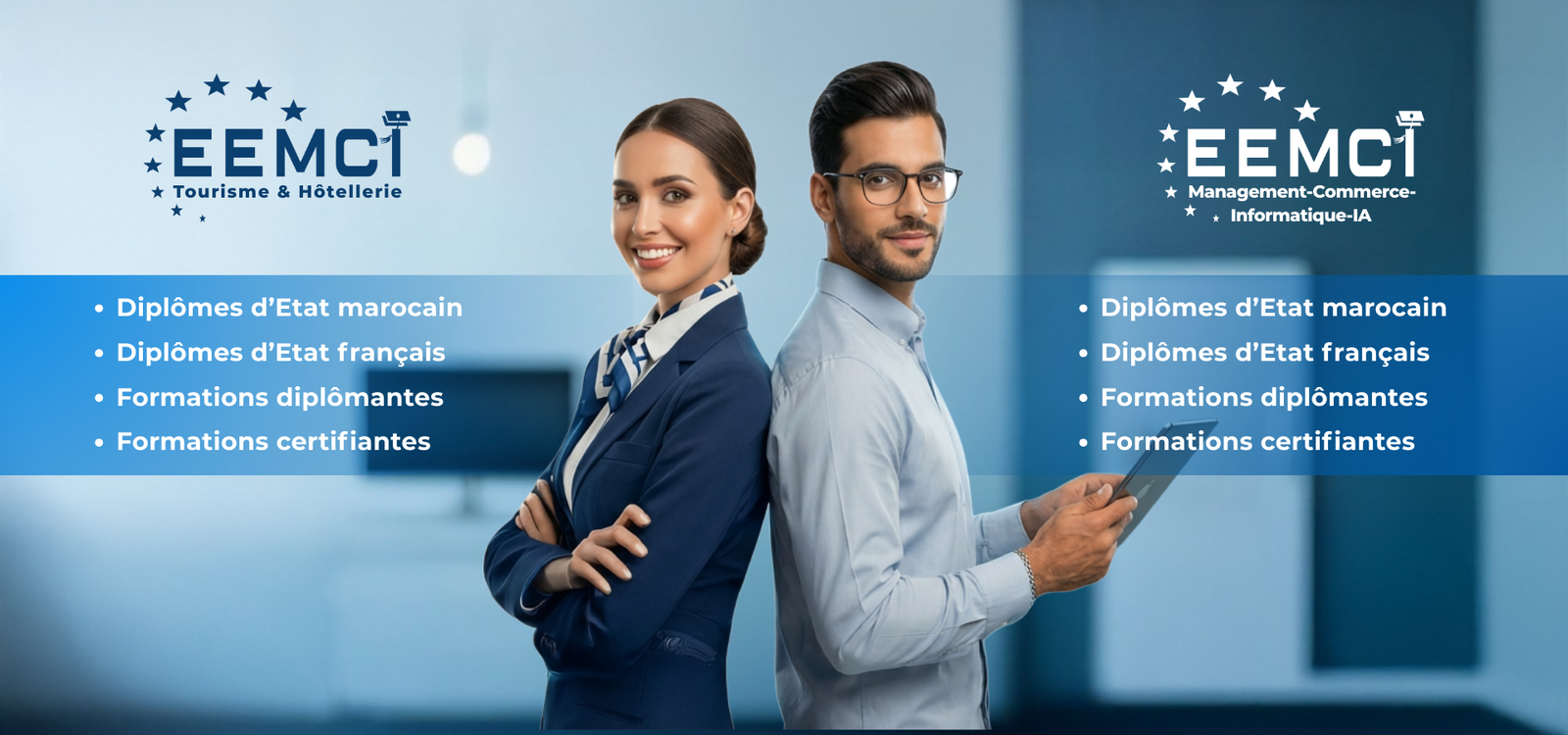 Nous invitons tous les esprits ambitieux et désireux de bâtir une carrière solide à rejoindre notre école. À l’EEMCI, vous bénéficierez d’une formation théorique rigoureuse et d’un cadre pratique stimulant qui favorise l’apprentissage actif. Venez plonger au cœur de la stratégie et de l’excellence, et développez les compétences nécessaires pour exceller et faire une réelle différence dans le monde des affaires.